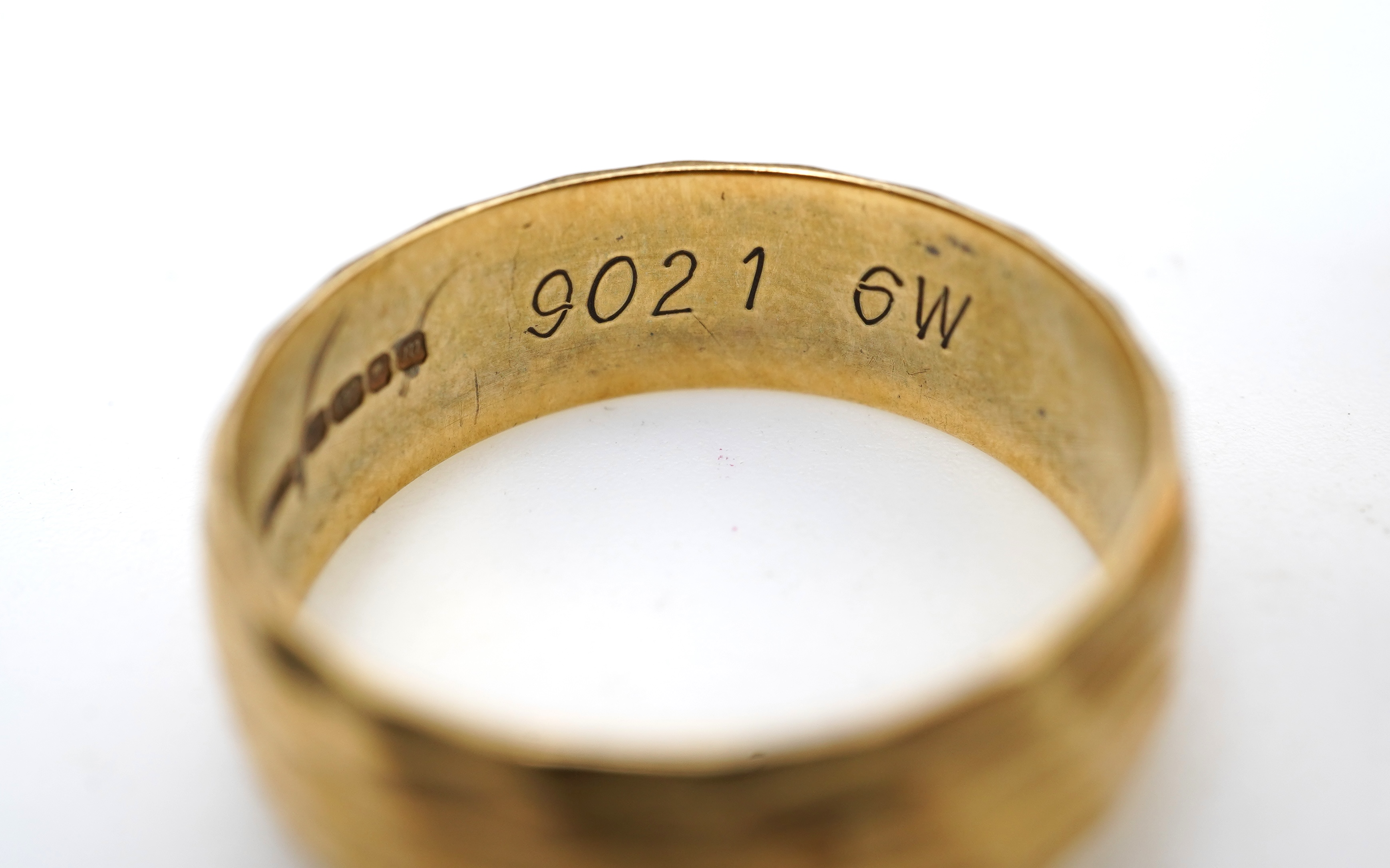 Lot 2969 , Three rings, comprising: two 18ct gold wedding bands, of planished and textured design, sizes K and L respectively, each with British hallmarks, combined gross weight approximately 11 grams; and a shell cameo ring mounte