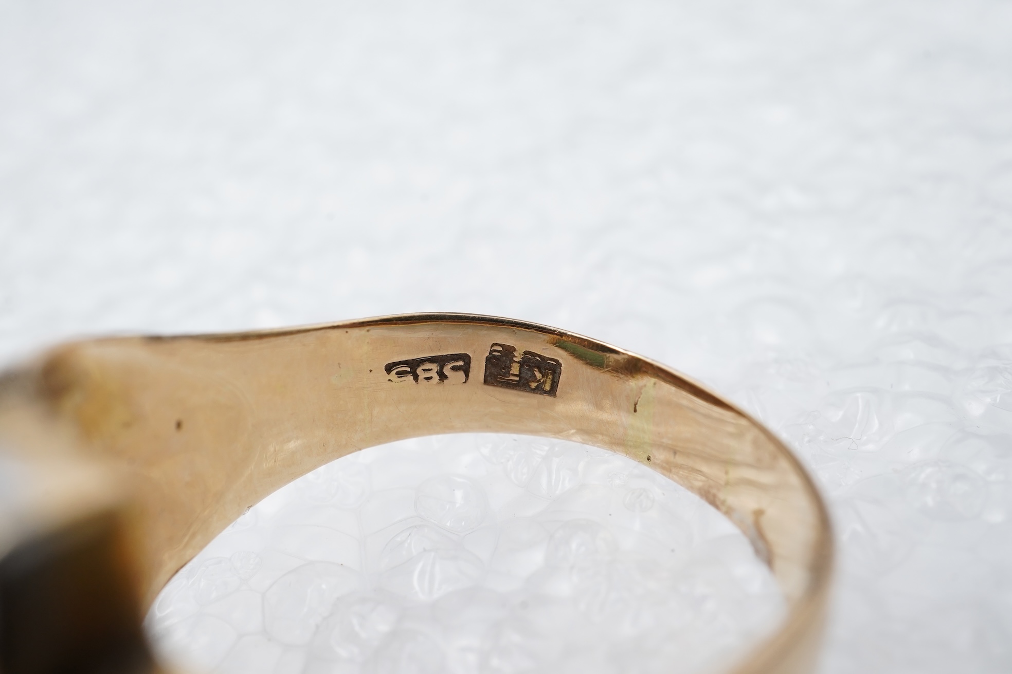 A ruby, emerald and diamond ring, mid 20th century, of geometric design, set with an oval ruby weighing approximately 0.50 carats, brilliant-cut diamonds and square emeralds, in a bicoloured gold mount, size L, stamped 585, gross weight approximately 5.5 grams