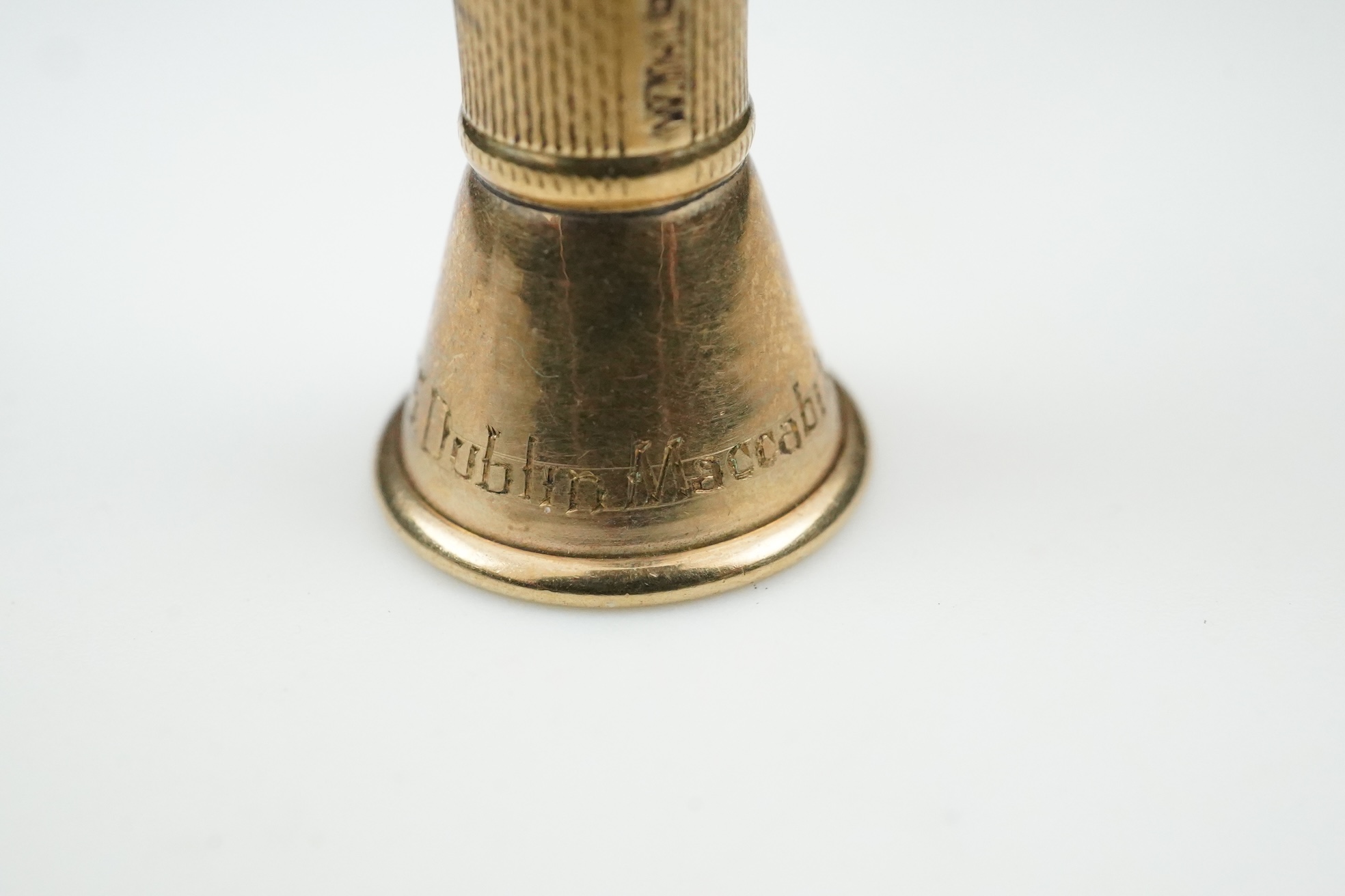 A 9ct gold cigar piercer, mid 20th century, of flared design, the piercer operated by pushing the top down, inscribed 'Maccabi Iodack Solomons May 1955 Dublin', length 7.4cm, British hallmarks, gross weight approximately 8.5 grams