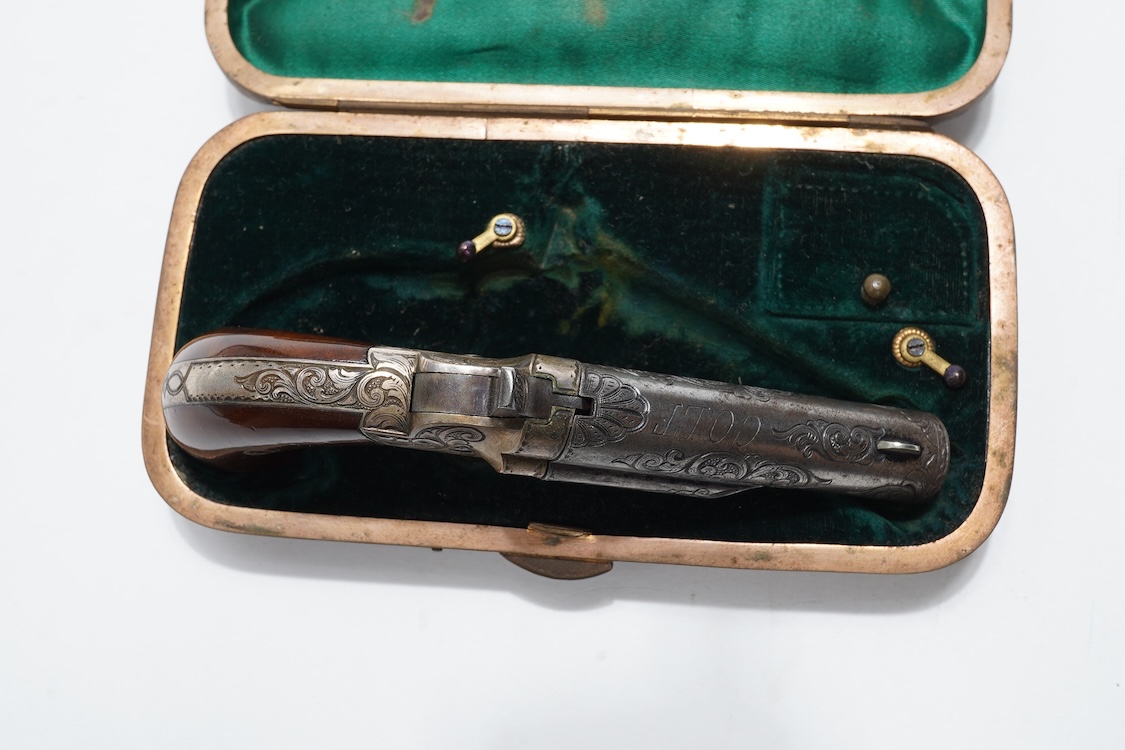 A cased 0.41 of an inch Colt single shot Deringer type rimfire pistol with foliate engraved frame and barrel, London proof marks two-piece polished walnut grips, in its contemporary ‘cigar case’ housing with green velvet lining
