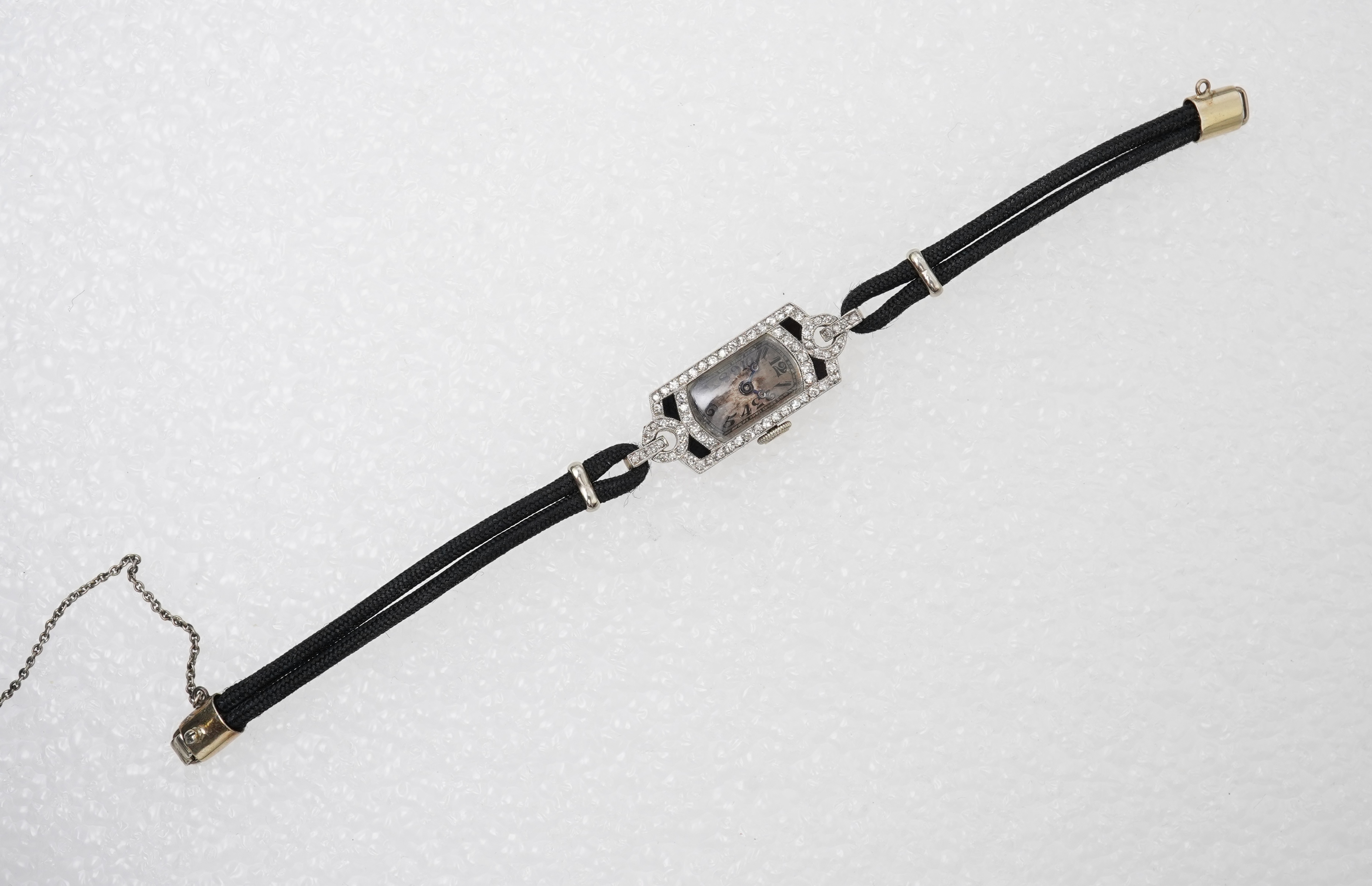 An Art Deco onyx and diamond cocktail watch, France, circa 1920, the silvered dial with Arabic numerals and blue steel hands, to a case of geometric design set with circular-cut diamonds and panels of onyx, to a black cord strap, case width 1.1cm, bracelet length 13cm, manual winding movement numbered 35448, case back numbered 10885, case with French assay marks for platinum, and maker's mark GM with crossed hammers, interior with French assay mark for 18ct gold