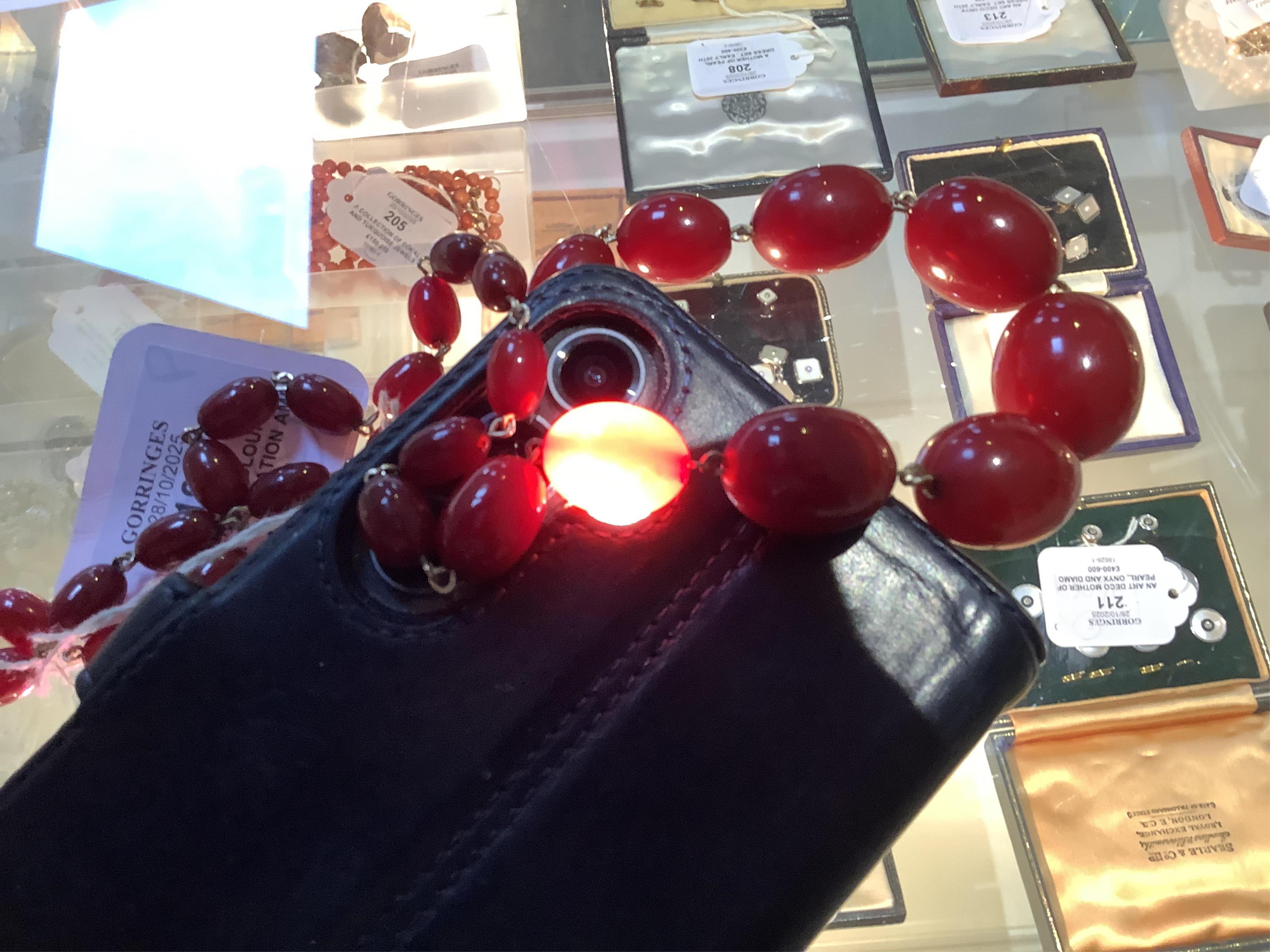 Lot 193 , A cherry-coloured bakelite imitation amber necklace and a glass bead necklace