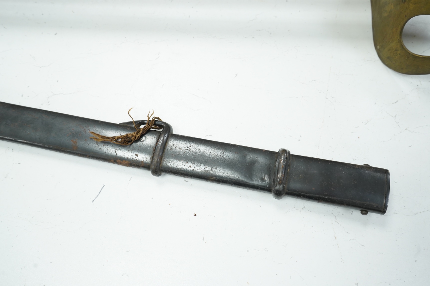 A 19th century Swedish cavalry trooper’s sword, regulation brass guard with pierced opening brass wire bound grip blade struck with military markings, in its black iron scabbard