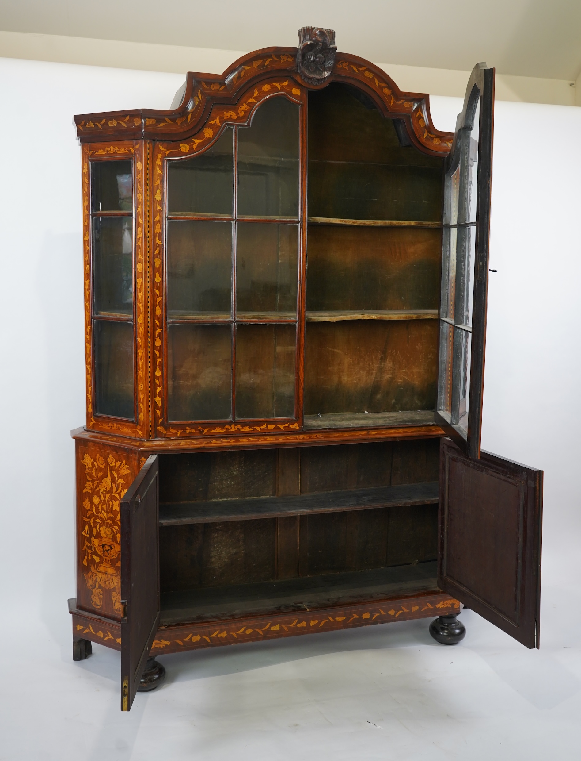 A late 18th/early 19th century Dutch floral marquetry walnut display cabinet, the arched carved pediment over two glazed, barred doors and panelled cupboard base on bun feet. 168cm wide, 34cm deep, 232cm high.
