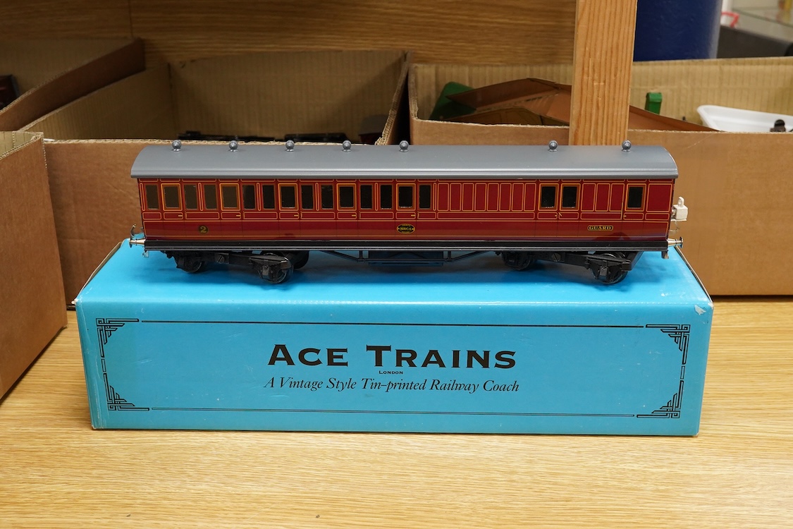Lot 281 , Four ACE Trains 0 gauge tinplate coaches; a boxed C/1 HRCA Brake Second, two boxed C/3 coach kits - a 3/3rd and a 3rd Brk., together with an unboxed LMS First Third composite