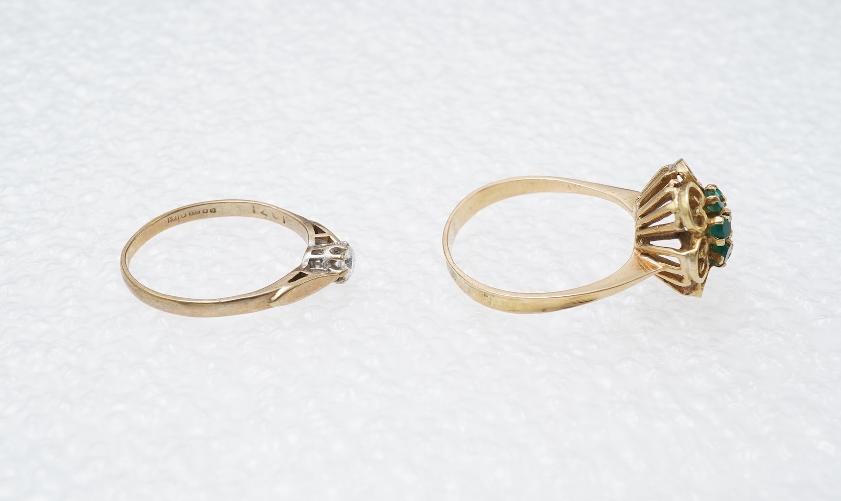 An emerald cluster ring and diamond solitaire ring, comprising: a ring set with a brilliant-cut diamond weighing approximately 0.15 carats, mounted in 9ct gold, size N1/2, British hallmarks, gross weight approximately 1.4 grams; and a ring of scrolled design set with a cluster of circular-cut emeralds, mounted in gold, size Q, stamped K18, gross weight approximately 3.5 grams