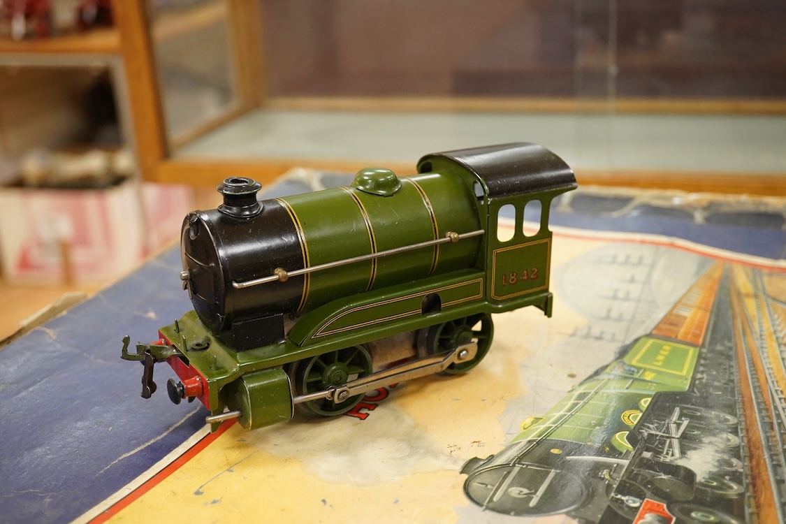 Lot 287 , Two Hornby 0 gauge tinplate clockwork train sets; a No.601 LMS Goods Set with 0-4-0 tender locomotive, 5600, in maroon livery, etc., together with a No.501 LNER passenger set with 0-4-0 tender locomotive, 1842, in green