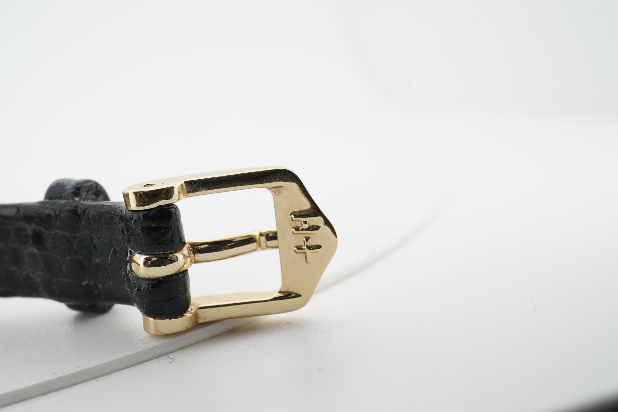 Lot 922 , A lady's recent 9ct gold Rotary quartz wrist watch, with oval Roman dial, case diameter 18mm, on an associated leather strap, no box or papers.