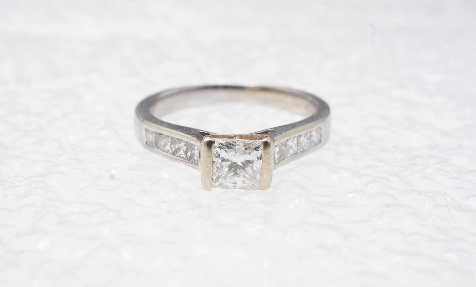 A diamond ring, tension-set with a princess-cut diamond weighing approximately 0.50 carats, to shoulders channel-set with smaller princess-cut diamonds totalling approximately 0.40 carats, mounted in 18ct white gold, size K1/2, British hallmarks, gross weight approximately 3.4 grams