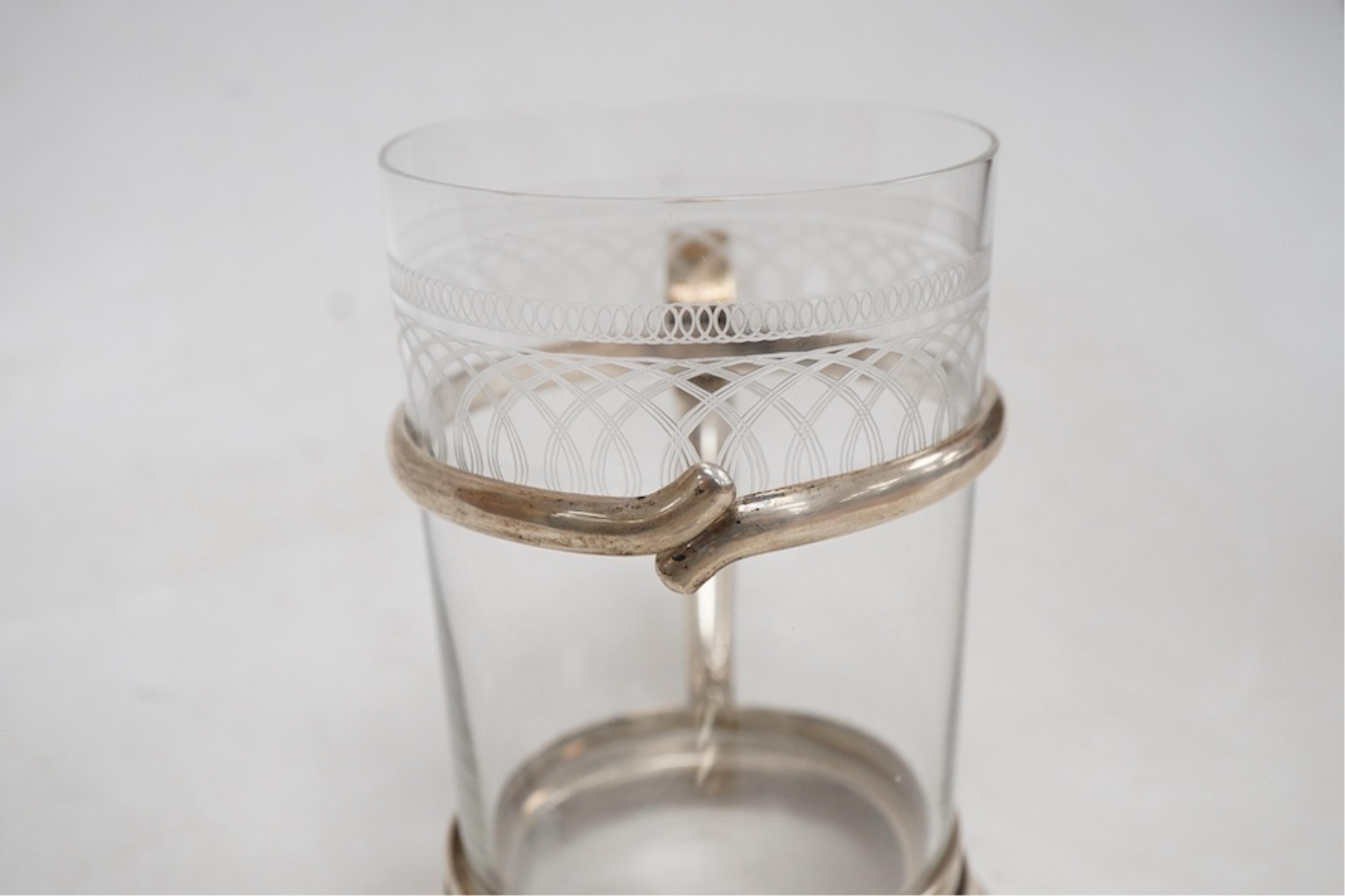 Two late 19th/early 20th century Russian 84 zolotnik podstakanniks with Cyrillic engraving and engraved glass beakers, one master PJS, St. Petersburg, together with two Russian 84 zolotnik and niello spoons, with Cyrillic engraving, tallest 92mm.
