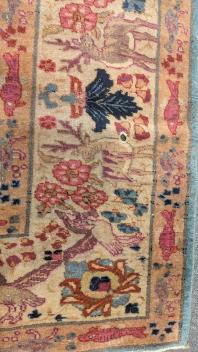 with central foliate medallion issuing a pair of palmettes, the spandrels with deer and the wide ivory ground border with deer and birds amid flowerheads and foliage, 376cm x 247cm