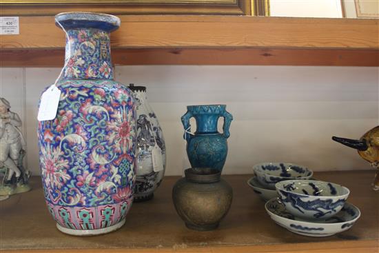 Canton enamelled vase (rim a.f), tea bowls & saucers, Delft lamp base & sundries