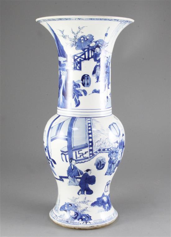 A large Chinese blue and white yen-yen vase, Kangxi period, painted with figure scenes, probably taken from the Romance of the Western Chamber, 44.5cm, upper neck and rim broken and glued