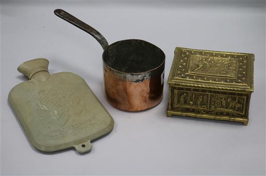 An early child's hot water bottle cover, saucepan and brass box