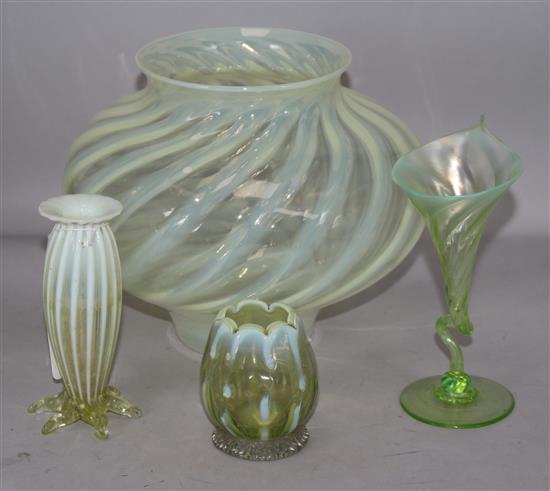 Lot 21 , A vaseline glass lamp shade and three vases