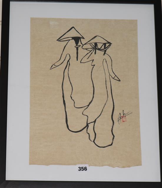Three Oriental figurative paintings, 40cm x 28cm