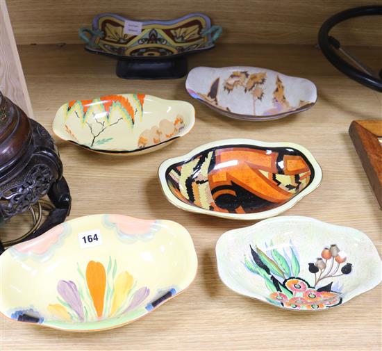 A Carlton Ware Orchid pattern 3325 footed dish and five Carlton Ware Art Deco lozenge dishes, including Witches' Castle longest 31cm (6)