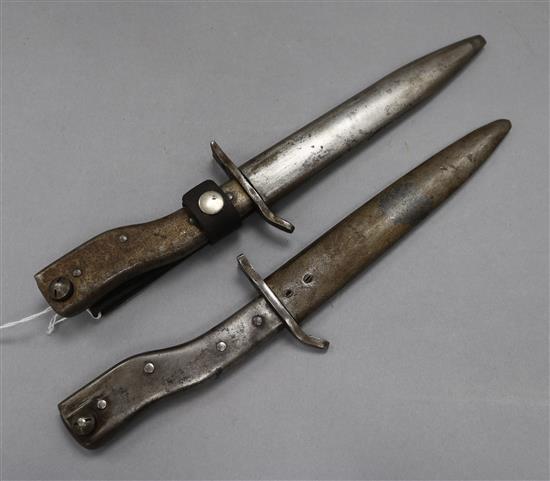 Two German Ersatz combination bayonets, marked: Gesetzlich, Deschutzt, Demag Duisburg longest 28cm