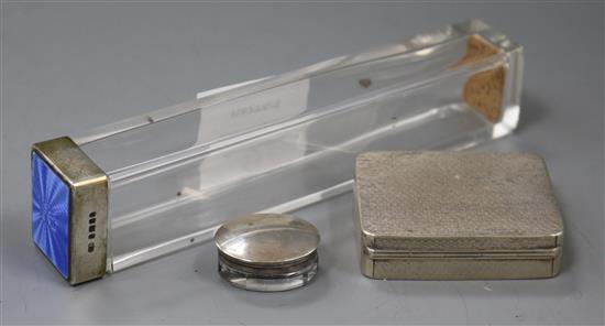A silver compact (a.f.), a small white metal topped glass box and a silver and enamel glass box.