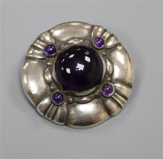 A Danish Georg Jensen sterling silver and amethyst cabochon set brooch, no 50, 40mm.