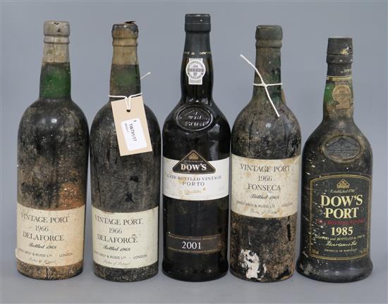 Five bottles of port, including Fonseca 1966, Delaforce 1966 (2) and Dow''s 1985 and 2001 late bottled vintages