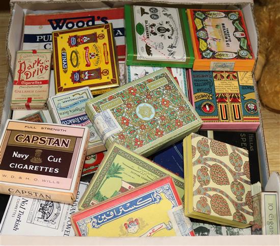 A collection of old cigarette packets and tobacco tins, some cigarettes included
