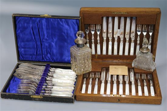 Two silver scent bottles and two sets of cased fish eaters