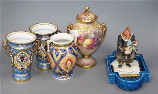 An Aynsley fruit painted vase and cover and three Noritake vases etc.