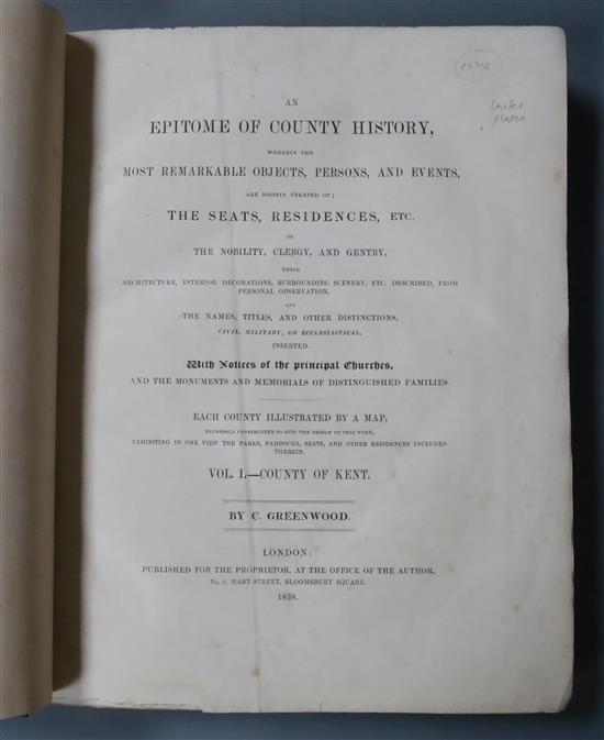 Greenwood, Christopher - An Epitome of County History, Vol I (all pbd), County of Kent, 4to, lacks plates, cloth backed drab boards, London 1838