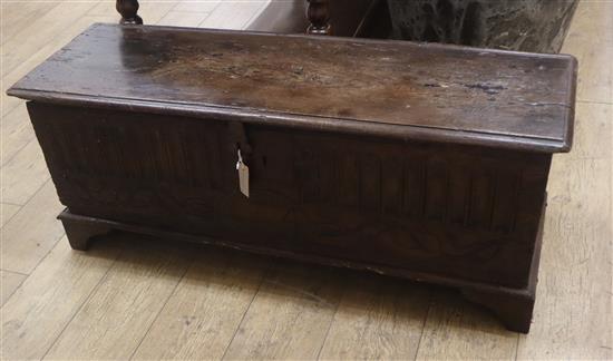 An early 18th century oak coffer, the front carved with vertical flutes and dated 1714 W.114cm