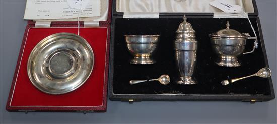 A three-piece silver condiment set and a silver Churchill commemorative dish (both cased)