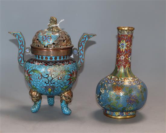 A 19th century Chinese cloisonne enamel tripod censer and cover and a bottle vase tallest 17cm