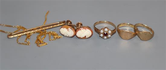 Three 9ct gold rings, a 9ct gold tie-pin, a fancy chain (a.f) and a pair of cameo earrings