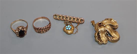 A Victorian yellow metal and gem set brooch, two 9ct gold rings and a turquoise set pendant brooch.