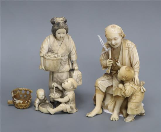 Two Japanese ivory okimono of figures with children, one signed to a red lacquer tablet, Meiji period