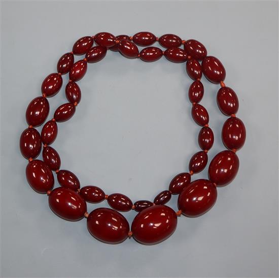 A single strand graduated simulated cherry amber necklace, gross weight, 114 grams, 82cm.