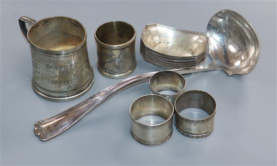 An American sterling mug, a set of twelve sterling salts and five plated items.