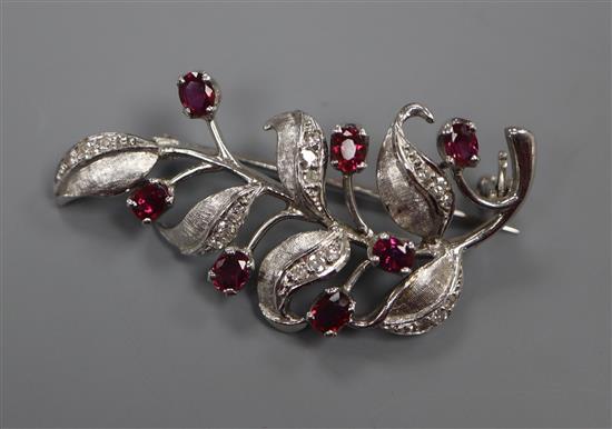 A modern 18ct white gold, ruby, diamond set leaf brooch, 41mm.