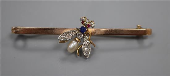 An early 20th century 9ct, diamond, sapphire, baroque pearl and ruby set 'fly' bar brooch, 59mm.
