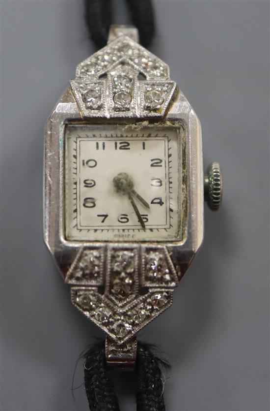 A ladys white metal (stamped platinum) and diamond set cocktail watch, on fabric strap.