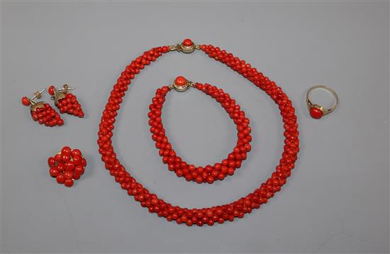 Assorted coral jewellery, including necklace, bracelet, pair of earrings and a brooch.