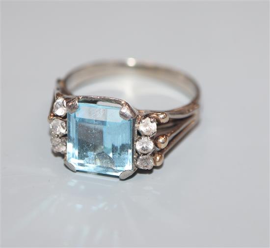 A white metal, aquamarine and white sapphire? set dress ring, size O.