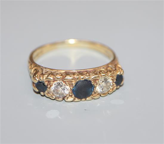 A modern Edwardian style 18ct gold, three stone sapphire and two stone diamond half hoop ring, size R.
