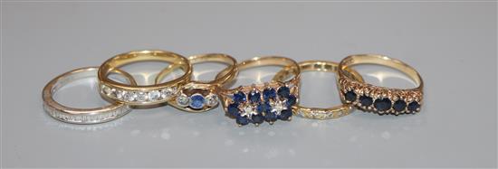 Six assorted gem set rings, including two 18ct and diamond half hoop, 18ct sapphire and diamond, two 9ct and one yellow metal.
