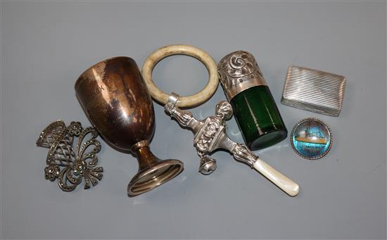 A quantity of mixed silver to include an egg cup, rattle, snuff box, salts bottle, etc.