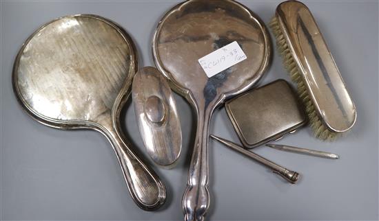 Two silver hand mirrors and four other items including silver cigarette case, brush and toilet jar.