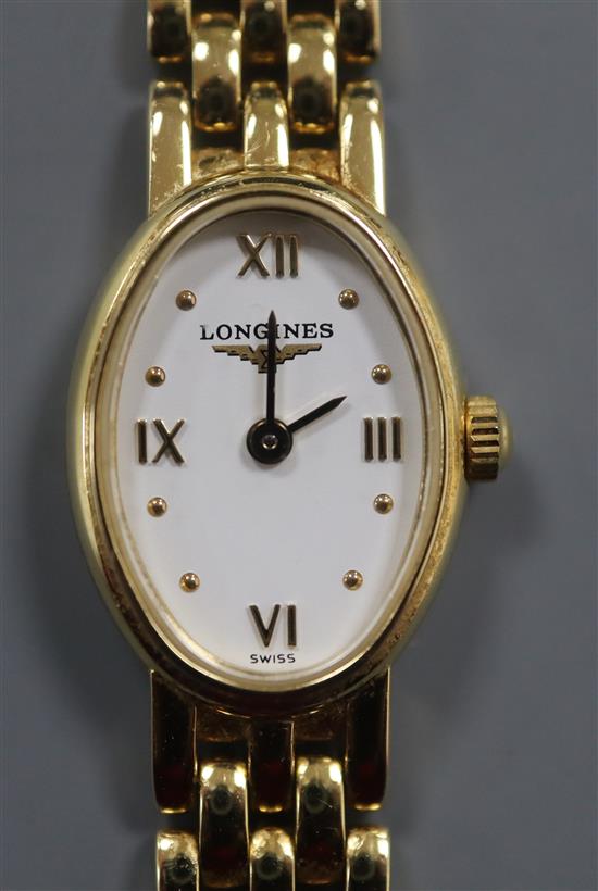 A lady's 750 yellow metal Longines manual wind wrist watch, on Longines 750 strap, with Longines box.