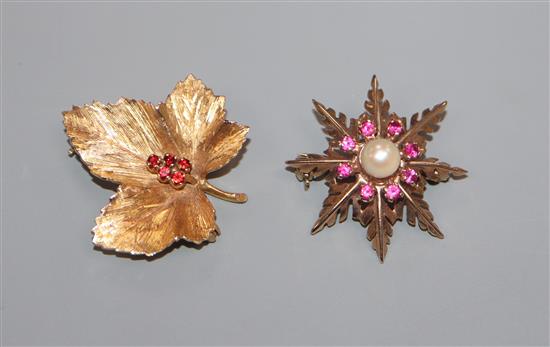 Two 9ct gold and gem set foliate brooches, largest 29mm.