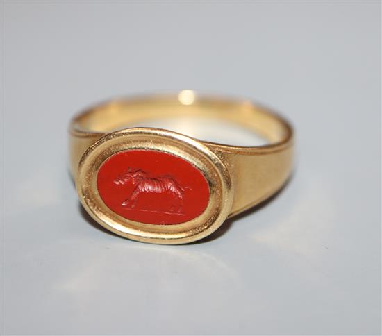 An antique yellow metal and carnelian signet ring, the oval stone carved with the figure of a warthog, size Q.