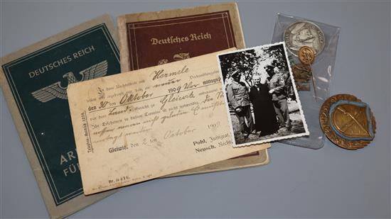 Two World War II German workers books and Adolph Hitler 5 mark coin and assortment badges